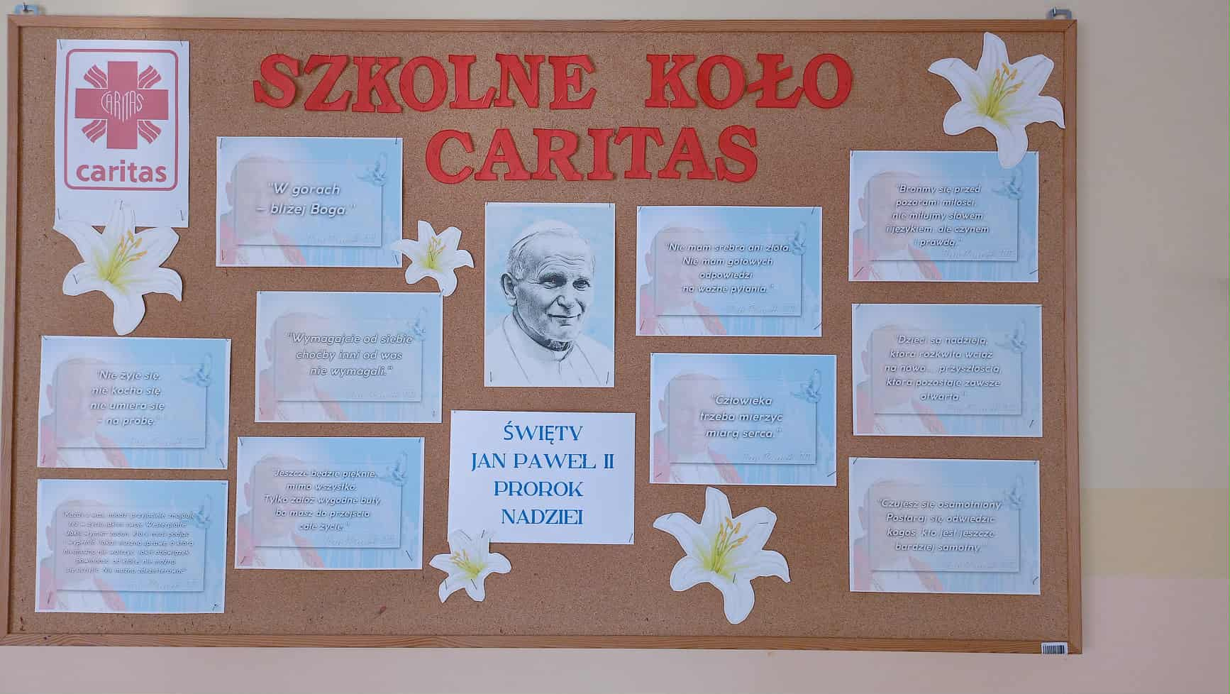 Z okazji 25 Dnia Papieskiego Szkolne Coło Caritas przygotowało gazetkę szkolną o Janie Pawle II. Tematem gazetki były cytaty z kazań, które głosił Papież. Warto przypominać słowa Jana Pawła II ponieważ są one inspiracją i promują najważniejsze wartości: miłość, solidarność, odwagę i godność.